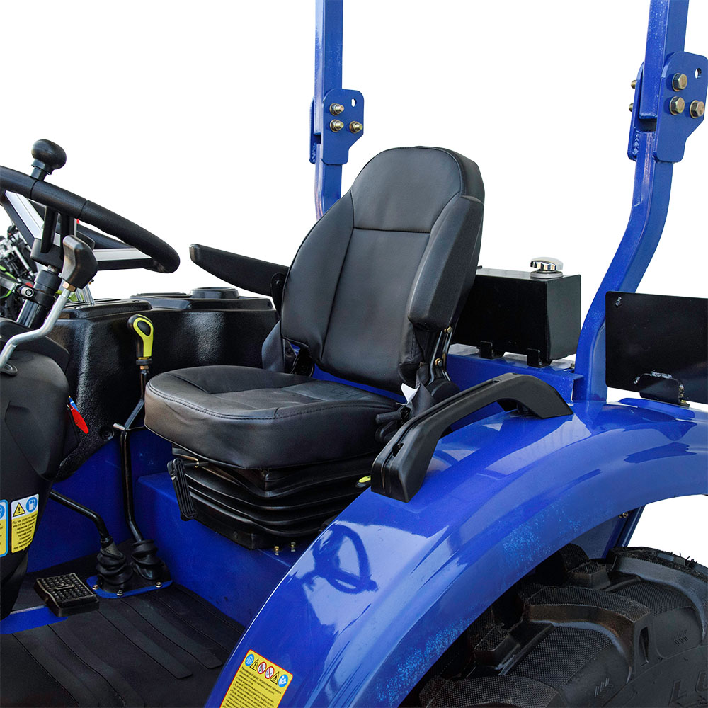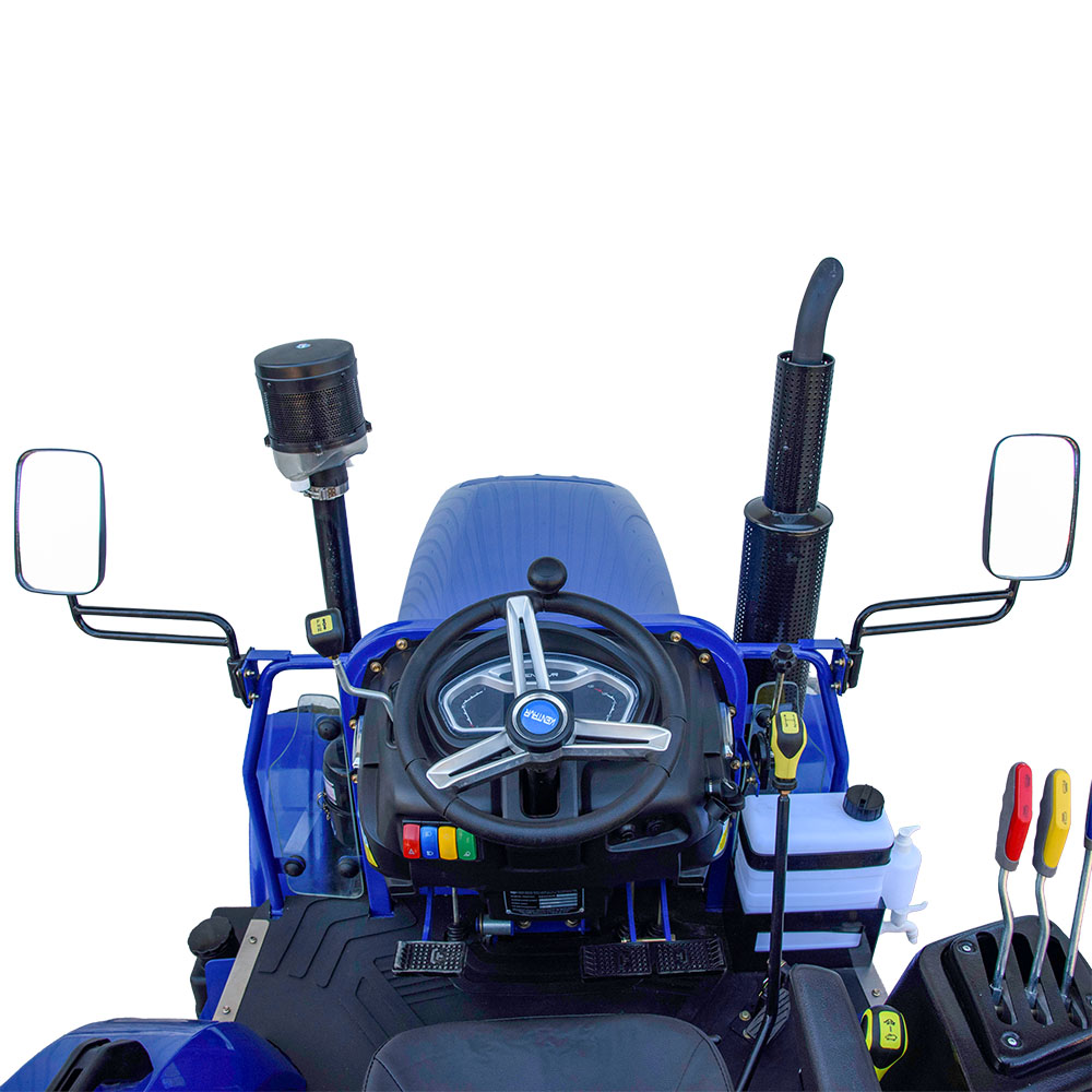 Место водителя продумано с учётом длительной работы. Амортизированное сиденье с регулировкой и подлокотниками снижает усталость, ровный пол добавляет комфорта, а электронная приборная панель позволяет удобно контролировать основные параметры работы трактора. Светотехника обеспечивает хорошую видимость в тёмное время суток, что важно во время сезонных работ.