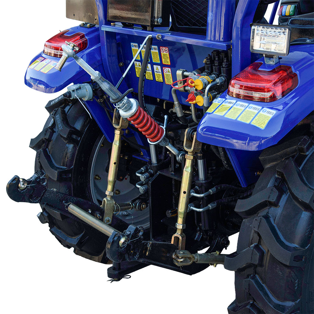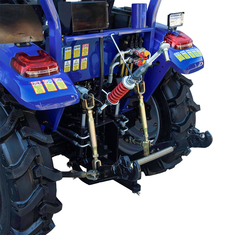 Задняя трёхточечная навесная система делает KENTAVR B244DXU универсальным помощником в хозяйстве. Трактор совместим с широким спектром навесного оборудования от почвообрабатывающей техники до прицепов. Вал отбора мощности с двумя режимами оборотов расширяет возможности использования активных агрегатов, а гидравлические выходы с быстросъёмными муфтами упрощают подключение оборудования.